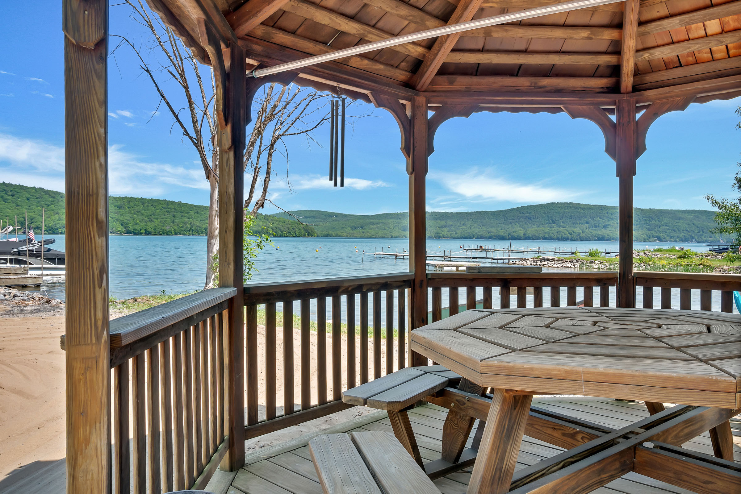 A beautiful view of the lake through the trees is the peaceful vista from the Inn's large deck. Umbrella covered tables and chairs are there for meals or for relaxing with a book or playing a board game available from our hospitality room's library.