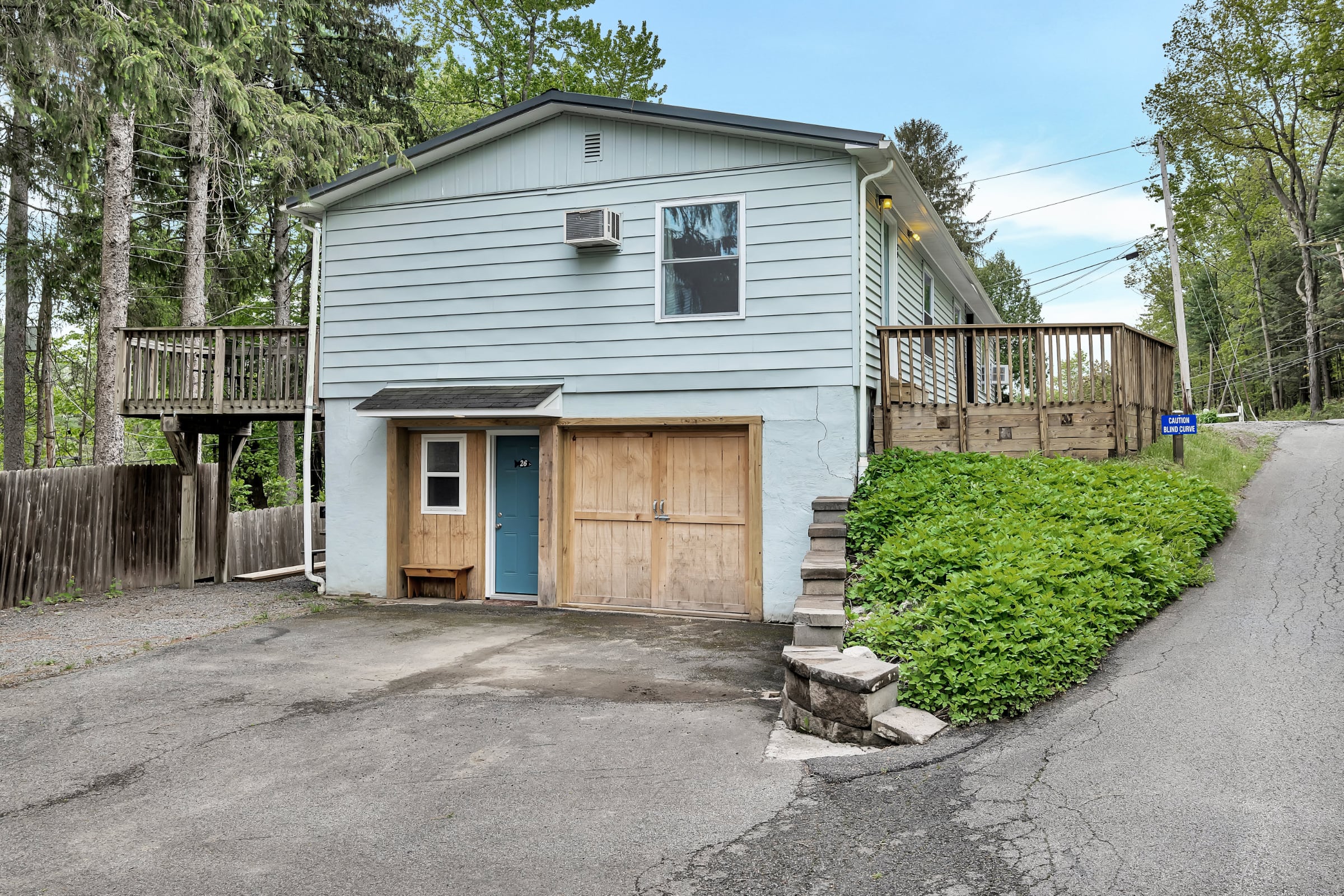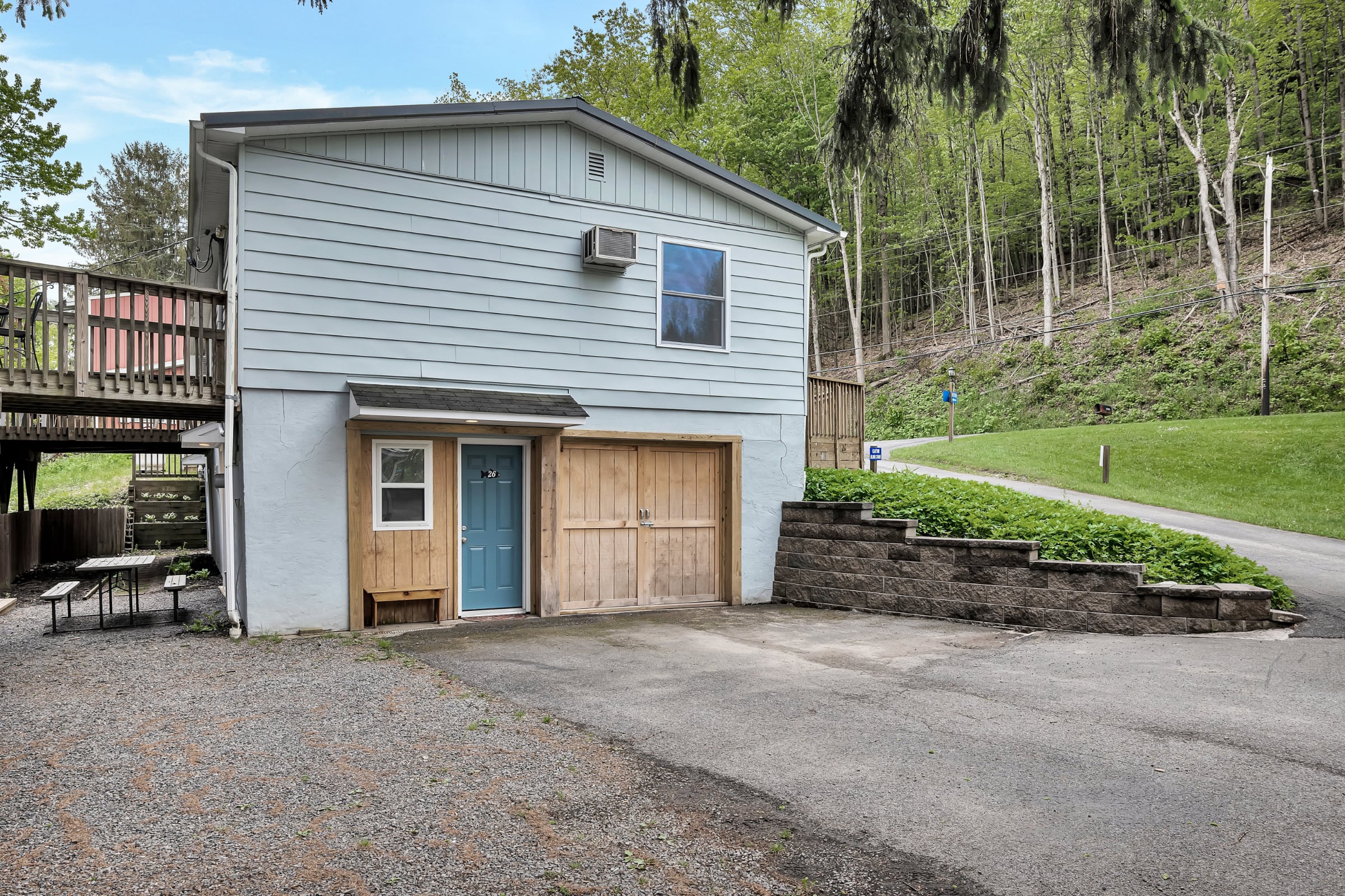 House 26 is a two-bedroom railroad layout cottage, located below House 28 and House 29. Its private deck looks out on a spruce woods with the lake scene in the distance. House 26 is conveniently located on State Highway 80 near the hospitality room, and game room (see map of premises)!