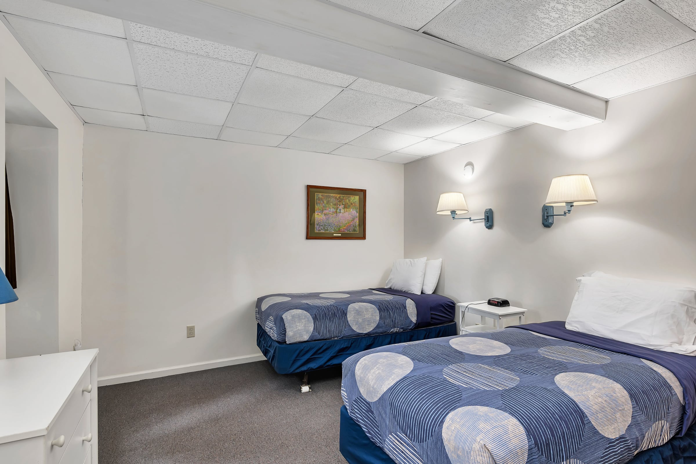 One bedroom has a queen bed, and the second bedroom has two twin beds. There is also a pull-out sofa in the living room.